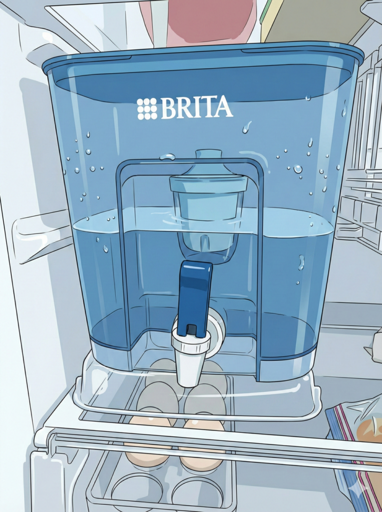 現在の私のスタイルは、1年ほど前に購入した三菱の冷蔵庫にBRITAをそのまま入れて使用しています。